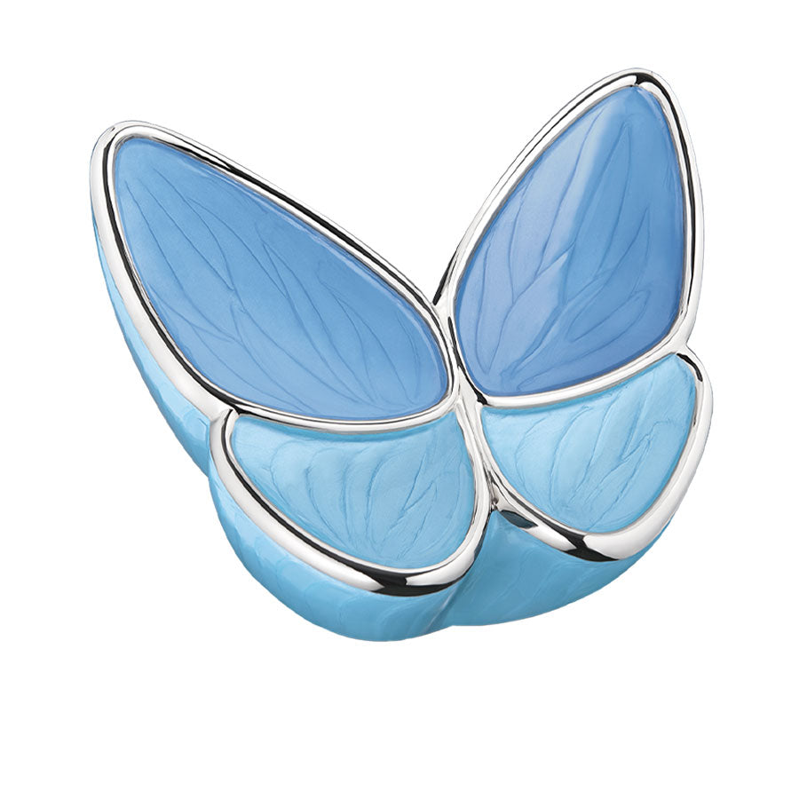 Introducing Butterfly Grace - Blue, the perfect way to honor your loved one. This blue cremation urn, beautifully designed in the shape of a butterfly with silver trim, represents the graceful spirit of your loved one. Made with care, this urn is a fitting tribute to their memory.