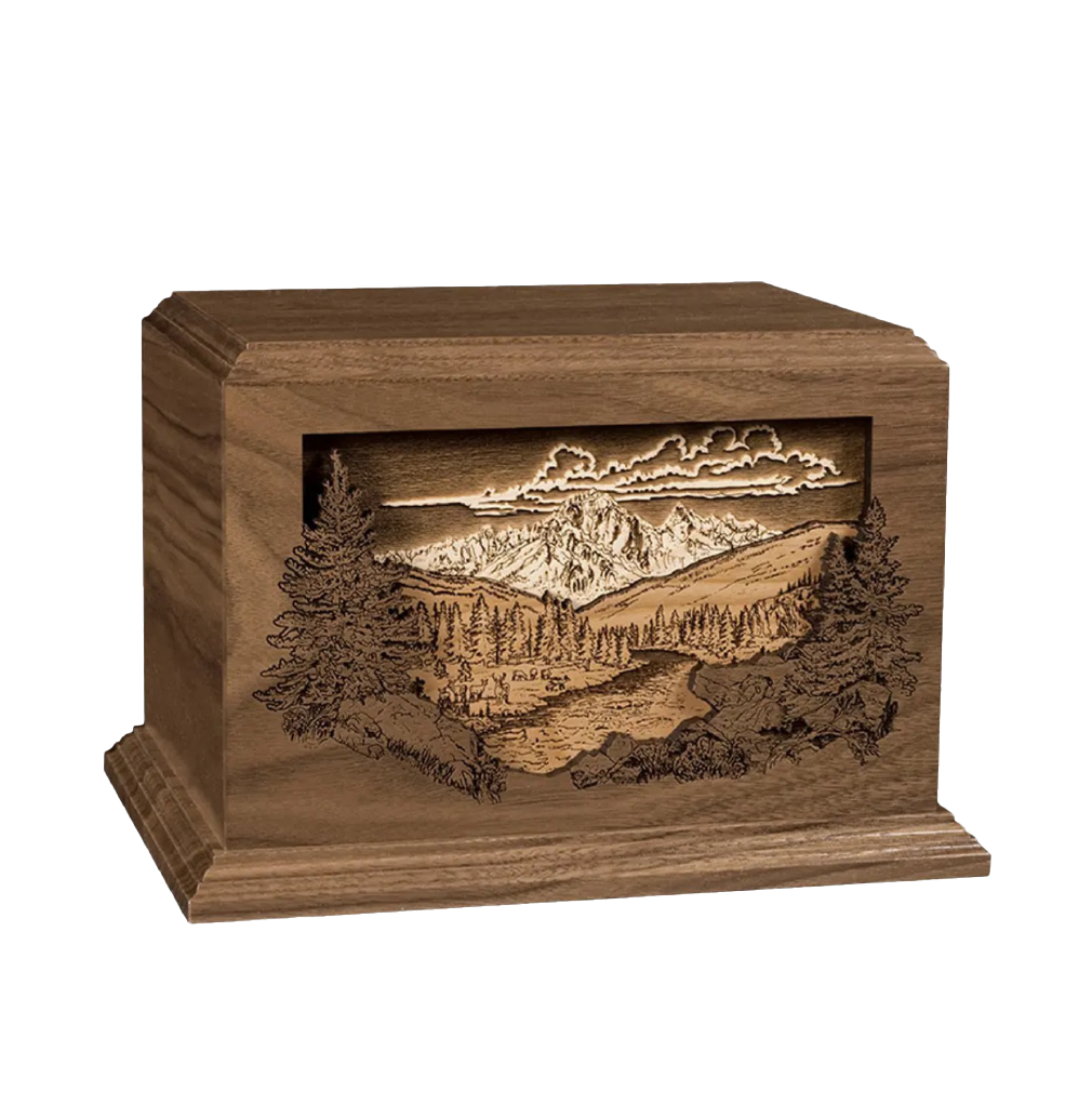 Crafted to honor the memory of your loved one, The Dimensional Mountain cremation urn features a serene mountain and nature scene on its wooden exterior. Expertly designed, this urn provides a peaceful and timeless tribute.