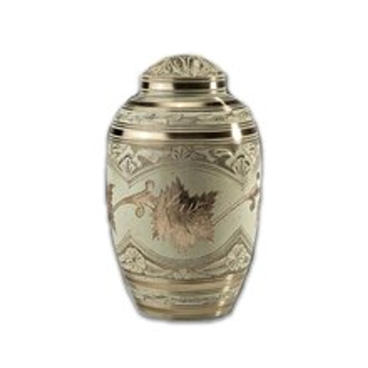 Made with precision, The Wash Leaf is a cream-colored cremation urn featuring elaborate engravings on genuine brass. This elegant urn provides a dignified final resting place for your loved one, ensuring their memory is honored with the utmost respect and reverence.